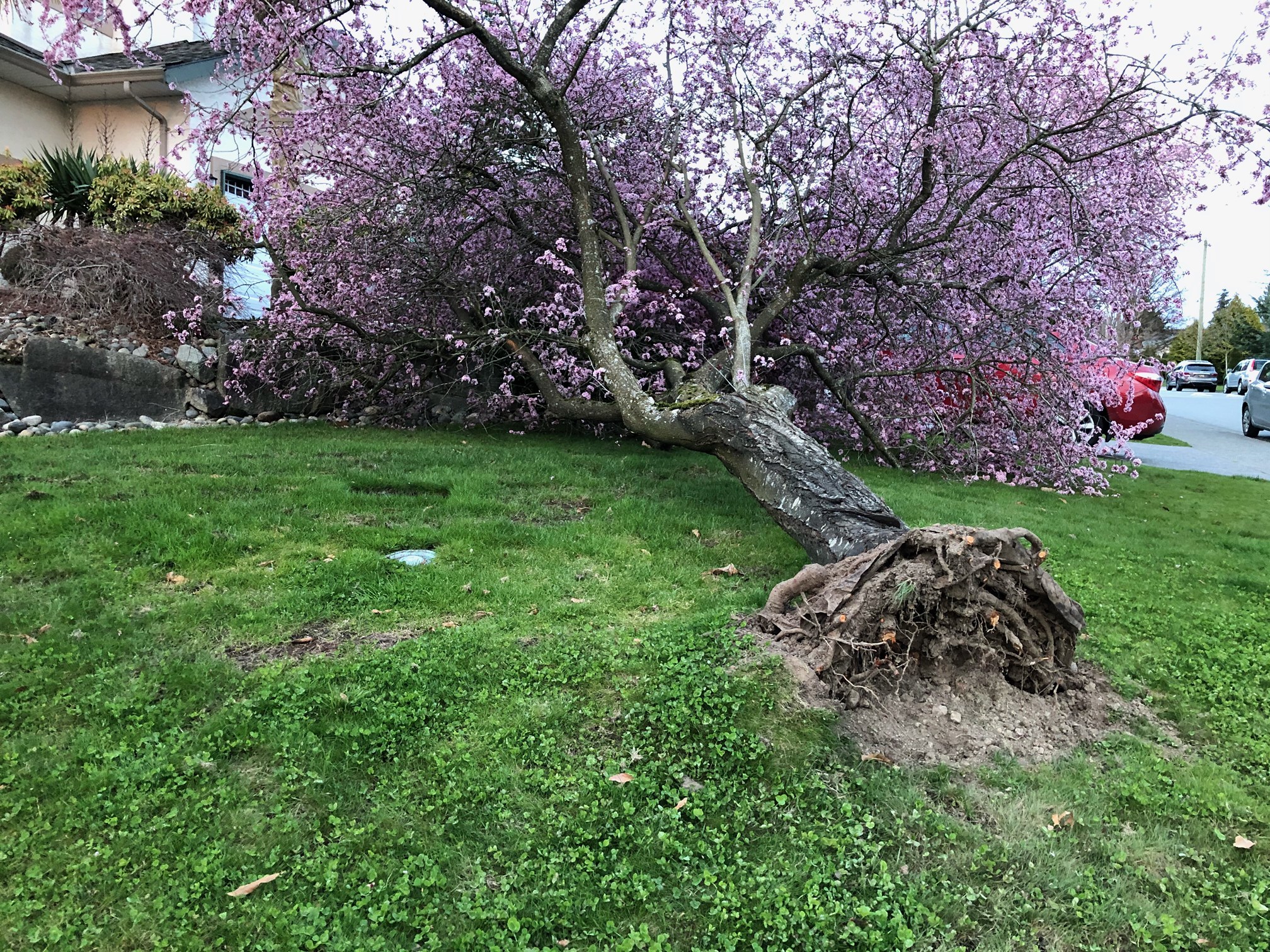 මලින් පිරුණු මේ සකුරා ගහ බිමට ඇද වැටුණේ පහුගිය සති අන්තයේ හමා ගෙන ගිය කුණාටුව නිසා බවට කිසිම සැකයක් නැහැ. කිසිම කෙනෙකුට හානියක් නොවුණත්, මේ කුණාටුව හෝරා කිහිපයක්ම තද සුළගක් විදියට වරින් වර හමා ගෙන ගියා. සකුරා ගහ මුලින් උදුරා දැමුවේ ඒ කුණාටුව නිසා බව ඉදිරී වැටුණු ගහ පාමූල වේළුණු මුල්වලිනුත් කියන්නට පුළුවන්. ගහ පිහිටලා තිබුණේ සකුරා මල් පිපිණු මාවත කෙළවර උස් කණ්ඩියක් පිහිටි ගෙවත්තක ඉදිරිපස කෙළවර. එතැන තරමක සුළං කපොල්ලක්.
