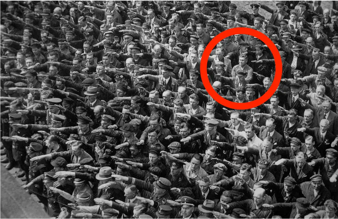 ඡායාරූපය අරගෙන තියෙන්නේ 1936 දී ජර්මනියේ හැම්බර්ග් නුවරදී. දෙවැනි ලෝක යුද්ධයට ඔන්න මෙන්න. සිය ගණනක් වූ වරාය කම්කරුවන් මේ විදියට තමන්ගේ පක්ෂපාතිත්වය පෙන්වමින් නාසි ආචාරය දක්වන්නේ හිට්ලර්ට. මේ කිව්ව නිහඬ මිනිසා හැරෙන්නට එතැන හිටිය වෙනත් කිසිම කෙනෙකුට හැඟීමක් තිබුණේ නැහැ වැඩි දවසක් යන්න කලින් හිට්ලර් ජනඝාතක බිහිසුණු මිනීමරුවෙක් වෙයි කියලා. අපේ අය වගේම තමයි, ජර්මනියේ බහුතරයක් හිතුවෙත් මේ එන්නේ රට ජාතිය බේරගන්න එන දියසෙන් කුමාරයාගේ ‘ජර්මන් වර්ෂන්’ එක කියලා.