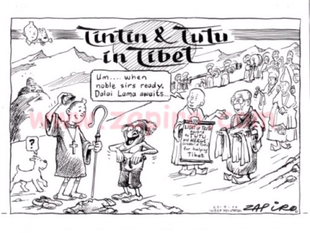 ආගමික දර්ශනයන් දෙකක් නියෝජනය කළත් අගරදගුරු ඩෙස්මන්ඩ් ටුටූ – දළයි ලාමා අතර තියෙන්නේ පුදුමාකාර මිත්රත්වයක්. 2006 අවුරුද්දේ බ්රසල්ස් නුවර තිබුණු ජාත්යන්තර රැළියක දී ටුටූ තමන්ගේ දේශනය ඇරඹුවේ සුප්රකට ටින්ටින් චරිතය ඇසුරින් දකුණු අප්රිකානු පත්තරයක පළ වුණු ‘Tintin and Tutu in Tibet’ කියන කාටුනයත් අතට අරගෙන. දළයි ලාමා සමහර වෙලාවට තමන් කවුද කියලා අමතක කරලා දඩබ්බර වැඩ කරන නරක කොල්ලකු විදියට හැසිරෙනවා කියලා සරදම් කරපු ටුටූ මෙහෙමත් කිව්වා: “ ඔයිට වඩා හොඳට හැසිරෙනවා නම් හොඳයි. මිනිස්සු අපි දිහා බලාගෙන ඉන්නවා. ඔයා සමාජය ඉස්සරහට එන්න ඕනේ අධ්යාත්මික නායකයෙකු විදියට කියන එක අමතක කරන්න එපා.” ඒ සරදමින් පස්සේ තවත් සරදමක්… “ දෙවියන් වහන්සේට මං පුදුමාකාර විදියට ස්තුතිවන්ත වෙනවා දළයි ලාමාව මවපු එක ගැන. ‘මේ මනුස්සයා නම් පුදුමාකාර හොඳ මනුස්සයෙක්. ඒත් එයා ක්රිස්තියානි නොවීම කොයි තරම් නම් කණගාටුවක් ද?’ කියලා දෙවියන් වහන්සේ කල්පනා කරනවා ඇති කියලා ඔබට සමහරවිට හිතෙනවා ඇති. ඒත් ඔයාලා දන්නව ද…. දෙවියන් වහන්සේත් ක්රිස්තියානිකාරයෙක් නෙමෙයි.”